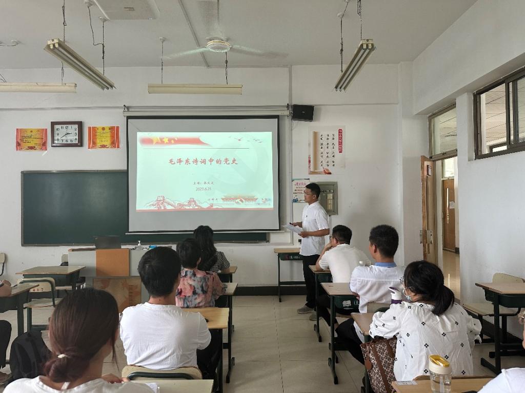 专题党课以“毛泽东诗词中的党史”为题,重点讲解了1910年秋毛泽东离开韶山冲探求救国救民之路到1935年10月到达陕北延安吴起镇期间,毛泽东创作的诗词及其中蕴含的党史。如写于1910年秋的《七绝•改诗赠父亲》中“孩儿立志出乡关,学不成名誓不还。埋骨何须桑梓地,人生无处不青山”,表达了青年毛泽东学有所成的决心和好男儿志在四方的人生追求;创作于1925年的《沁园春•长沙》抒发了毛泽东对中华民族前途的乐观主义精神和以天下为己任的豪情壮志;而《西江月•秋收起义》则描写了1927年秋收起义后,在革命异常艰苦的关头工农革命武装暴动的壮举,毛泽东的诗风开始由写景抒情转入纪实、走向战争;《渔家傲•反第一次大“围剿”》写于1931年4月红军成功粉碎国民党第一次大“围剿”之后、第二次大“围剿”进攻之时,毛泽东和朱德采取诱敌深入,集中优势兵力,运动战、速决战和歼灭战各个击破敌人等战术,使反“围剿”出奇制胜,以少胜多,以弱胜强,先后取得了第二次、第三次和第四次反“围剿”的胜利;1934年7月23日凌晨,受到接连错误打击和排挤、改做地方工作的毛泽东登上会昌山顶峰,写下《清平乐•会昌》,展现了毛泽东身处逆境而又百折不挠、积极乐观、昂扬向上的伟人风范,表明他对革命充满憧憬,黑暗即将过去,曙光正在前方;《忆秦娥•娄山关》的创作背景是1935年2月,惨败湘江以来长征途中的第一场大胜仗——娄山关大捷之后,从内到外生动地描写了红军指战员征战娄山关、从拂晓出发到傍晚结束战斗的紧张激烈场景。一句“雄关漫道真如铁,而今迈步从头越”道出了毛泽东对革命道路的冷静思索,不要说群山雄关像钢铁一般难以逾越,而如今让英勇的红军重振旗鼓向前,表现出了毛泽东和英勇红军面对艰难从容不迫的气度和博大胸怀;1935年10月19日,中央红军跳出敌人包围圈、翻越雪山、走出人迹罕至的草地,到达陕北延安吴起镇,回顾长征一年来所战胜的无数艰难险阻时,毛泽东满怀喜悦地写下了《七律•长征》。