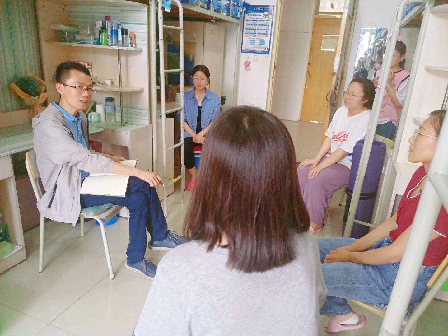 按照学院党员联系宿舍工作方案,教师党员以宿舍为阵地,开展贴近学生关爱行动。每位教职工党员到对接学生宿舍后,详细了解学生的学习生活、家庭、社会交往、班风学风、职业规划等情况,听取学生的意见建议,现场帮助解决学生实际问题,并进行心理健康教育、安全教育,重点是防诈骗知识教育,并与学生一起合影留念。
