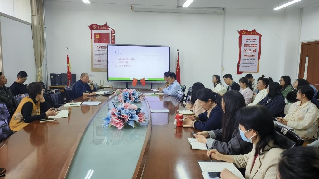 李中军对KY官网2025届考研情况进行了全面剖析。他指出,当前考研竞争日益激烈,学生个体存在差异,学院需以党建为引领,充分发挥党员教师的先锋模范作用,深入调研学生需求,建立“一人一档”考研跟踪机制,针对学生薄弱环节精准施策,切实提升学生的应试能力与综合素质。随后围绕“志愿选择”这一关键环节,李中军详细讲解了查询及掌握录取难度的具体步骤。他强调,要运用好中国研究生招生信息网与招生院校研究生官网,通过查询院校招生简章、复试分数线、一志愿录取名单、调剂方案等文件信息,进行数据比对判定录取难度。通过这一过程,为学生提供全面、精准的信息参考,引导学生结合自身专业兴趣和职业规划,理性评估自身实力,避免盲目跟风填报,确保学生志愿选择既契合个人发展愿景,又提高考研上岸成功率,真正将“以生为本”的理念落到实处。