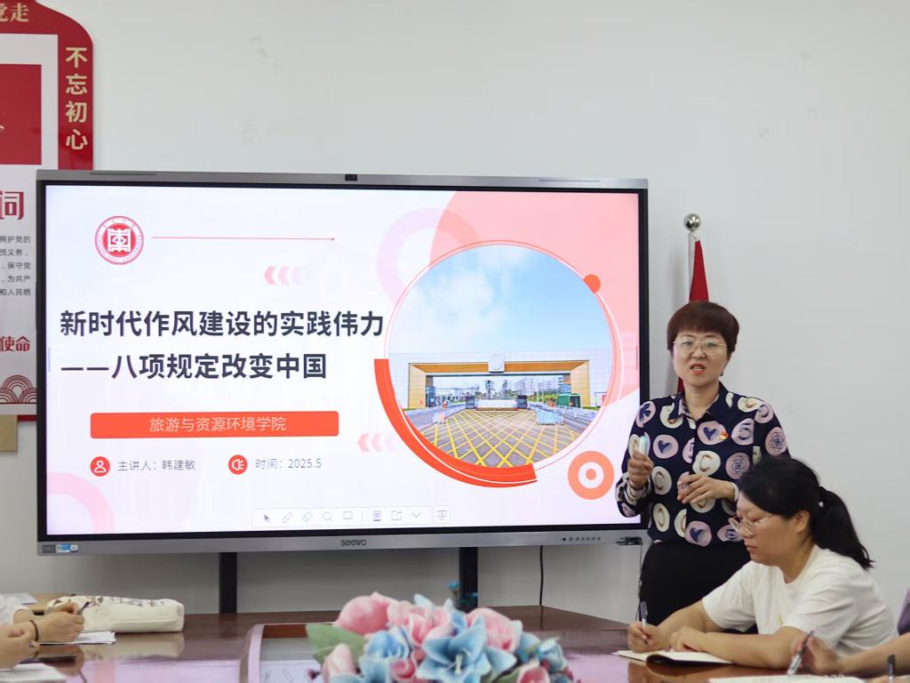 韩建敏强调,新时代党员不仅是变革见证者,更应成为传承者与践行者,要深刻领悟中央八项规定的实践伟力,以持之以恒的行动自觉锤炼优良作风。最后,韩建敏结合学院工作,对全体教师提出三点要求:一要以学铸魂,将习近平总书记关于作风建设论述作为必修课,领悟“打铁必须自身硬”的政治内涵;二要以行践诺,在校园工作中践行“短实新”文风会风,做学生的贴心服务者;三要以文化人,弘扬“崇实尚俭”新风,以实干精神推动学院高质量发展。