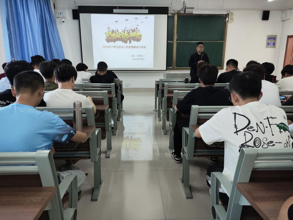宣讲会上,范增良分别从入伍的基本条件、流程、入伍所享受的优惠政策等方面向同学们解读当前的大学生征兵政策。此外,范增良还针对同学们普遍关心的入伍条件、服役期限、军旅生涯规划以及退役后的安置等问题进行了细致解答,帮助同学们全面了解参军的意义和未来可能发展的道路。会上,范增良呼吁同学们积极响应国家征召,选择参军入伍,以实际行动捍卫国家安全,同时也借此机会实现个人价值追求,为国家的繁荣稳定贡献自己的青春力量。