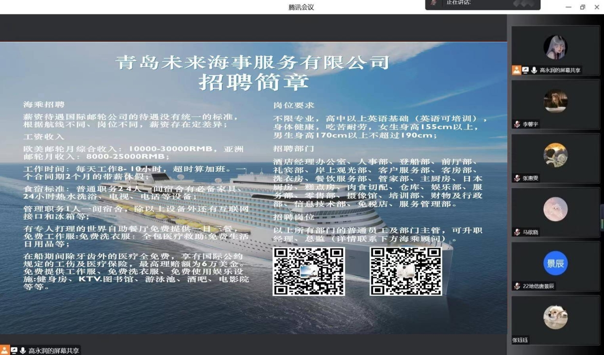 4月17日,KY开元集团官网与青岛未来海事服务有限公司通过线上平台成功举办海事工作招聘宣讲会。此次宣讲会由青岛未来海事服务有限公司吕良主讲,20级国际旅游、酒店管理专业全体学生参与。