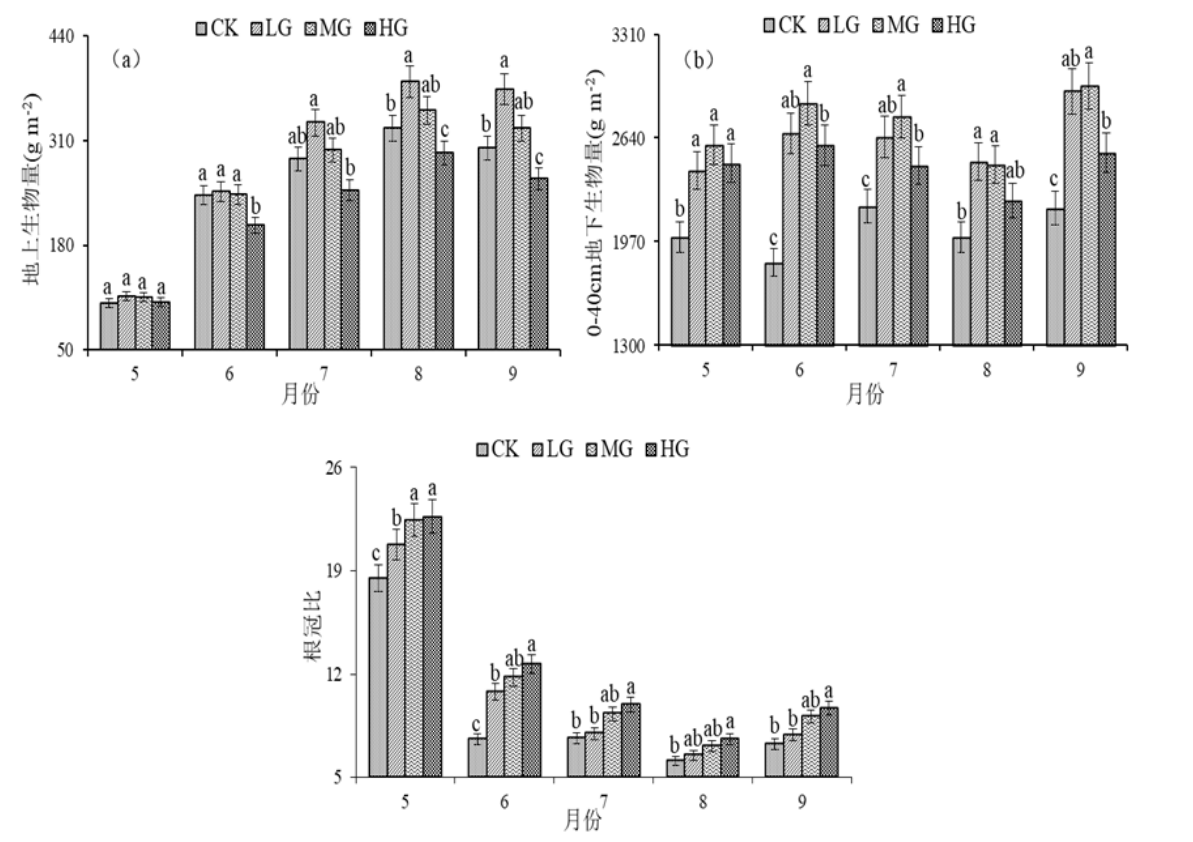 高寒草地是青藏高原主要的植被类型之一,然而其生物量及土壤性状变化特征与放牧管理的耦合研究仍相对薄弱,不利于高寒草地的可持续利用。本文以青藏高原东北部高寒矮嵩草草甸为研究对象,设置封育禁牧(CK)、轻牧(LG)、中牧(MG)和重牧(HG)放牧梯度试验样地,分析了不同放牧梯度下高寒草甸生物量与土壤性状变化特征及相互关系。研究表明,轻度和中度放牧有助于提高高寒草甸地上、地下生物量,完全禁牧和过度放牧都不利于高寒草甸生物量的提高,并且过度放牧会使根系更多集中于深层土壤。过度放牧改变了土壤营养元素的供需平衡,降低了生物量并增大了根冠比,适度放牧是维持高寒草甸可持续发展的必要措施。
