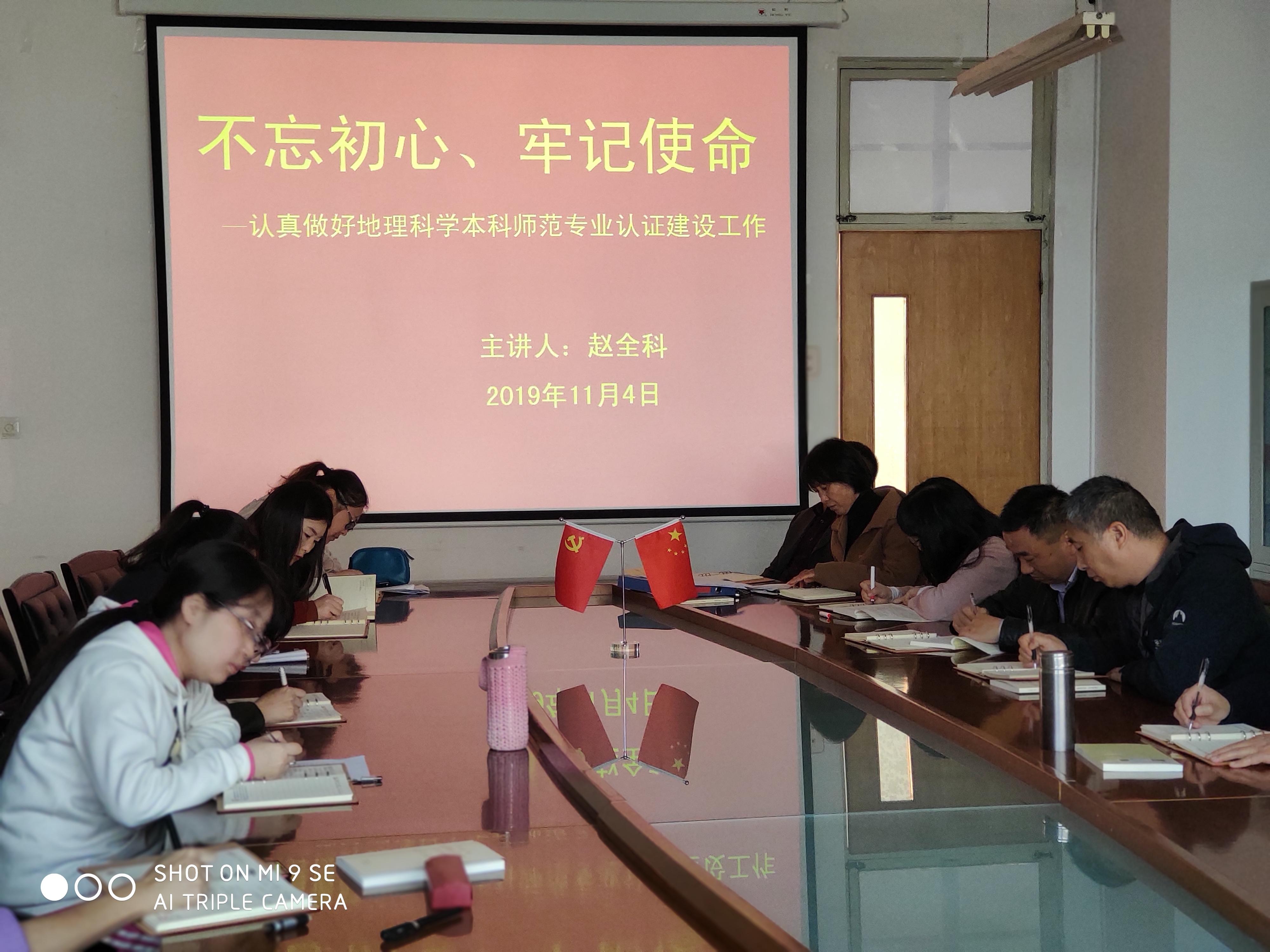 按照学校“不忘初心、牢记使命”主题教育工作部署与要求,11月4日下午,KY开元集团官网在理工楼2514会议室开展主题教育专题党课活动,院长赵全科讲了题为《不忘初心 、牢记使命—认真做好地理科学本科师范专业认证建设工作》的党课,全体党员聆听了党课。