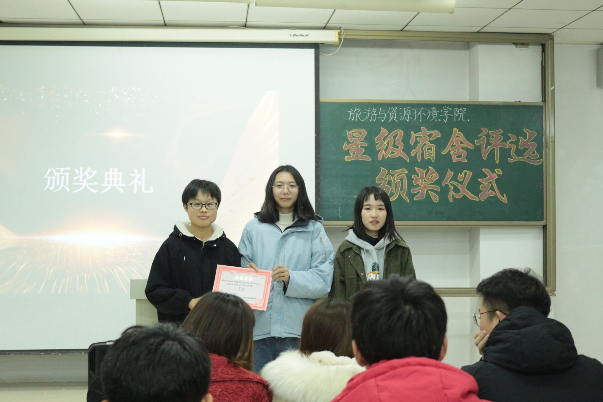 活动伊始,由宿管部成员李世龙同学详细的讲解此次星级宿舍的评选标准,并负责展示星级宿舍内部环境和播放获奖宿舍的PPT和宿舍安全短视频,在欣赏优秀宿舍作品的同时,大家学习了星级宿舍的长处,也在宿舍安全短视频中获得了许多启示。随后,主持人宣读获奖名单,各宿舍舍长上台领奖,并由五星级宿舍获奖代表董悦欣发表获奖感言。活动最后,文明自律委员会主席王诣做总结发言,提到即使星级宿舍评比已经结束,但宿舍的各方面仍旧需要加强管理,同时希望大家继续保持,并营造一个具有浓厚学习氛围的宿舍环境。
