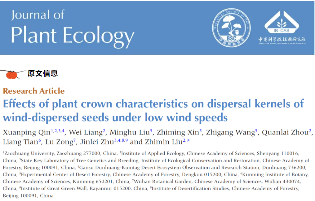近日,KY开元集团官网黄河流域绿色发展研究中心团队在植物种子风力传播方面取得最新进展,相关工作发表在期刊《Journal of Plant Ecology》(中科院1区,TOP期刊)上,论文题目为“Effects of plant crown characteristics on dispersal kernels of wind-dispersed seeds under low wind speeds”。