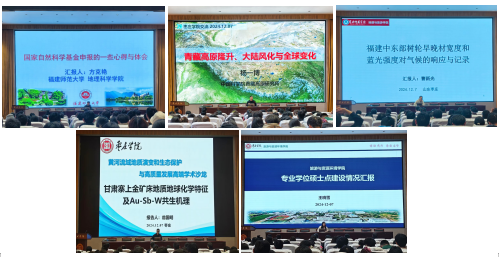 在学术交流环节,方克艳研究员分享了国家自然科学基金申报的一些心得与体会,深入细致地剖析了如何选题、开展有创新性工作的策略以及基金撰写的方法与技巧。杨一博研究员以青藏高原隆升、大陆风化与全球变化为题,阐述了利用黏土矿物比值定量重建大气CO2消耗的新方法以及利用同位素指标体系从河湖相沉积物中获取粉尘信号的新思路,创新性地提出了“构造-气候驱动干旱化-粉尘传输加强-新鲜物质在湿润区风化-提高风化度”的新认识。曹新光副教授采用树木年轮定年方法,通过断面积增量、树轮早晚材宽度、蓝光强度等内容分析了福建中东部树轮早晚材宽度和蓝光强度对气候的响应与记录。翁国明博士介绍了甘肃寨上金矿床地质地球化学特征及Au−Sb−W共生机理,指出成矿过程中氧逸度升高、流体混合和水岩反应共同促进了Au−Sb−W的共富集。王晓雪博士对标硕士点建设标准,从学院师资队伍、学科平台、科研成果、专业学位领域(方向)与特色等方面汇报了资源与环境专业硕士点建设的相关工作。
