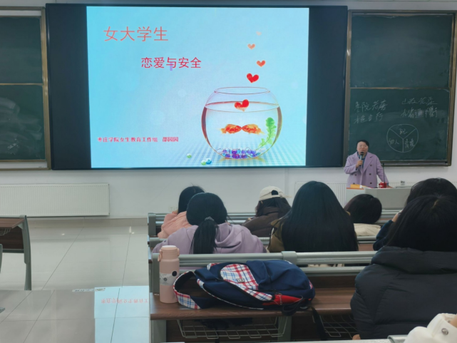 邵园园从“爱情到底是什么”“爱情需要什么”和“怎样去达到一个较好的爱情状态”三个问题展开论述,诠释爱情的真谛,帮助同学们提升爱与被爱的能力。随后,邵园园结合具体实例,聚焦当下女大学生在恋爱过程中常遭遇的心理挑战和安全问题,引导同学们正确认识自身情感需求,学会理性处理恋爱矛盾,并强调在恋爱观上应注重道德修养和精神追求,确保恋爱关系的纯洁、稳定与高尚。同时,邵园园围绕出行、住宿、兼职等多个方面指出并分析女生在安全防范中存在的不足以及应对方法,有助于加强同学们的安全防范意识、提高其风险应变能力。最后,邵园园指出“爱情不是生活的全部,爱自己才是终身浪漫的开始”,希望同学们在大学期间正确处理好恋爱、学习与生活的关系,塑造更好的自己。