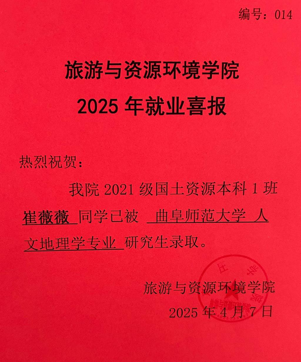 喜报!21国土资源本科1班崔薇薇被曲阜师范大学录取!
