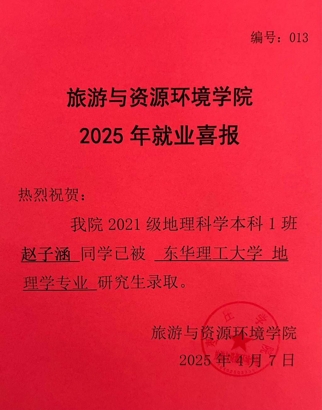 喜报!21地理科学本科1班赵子涵被东华理工大学录取!