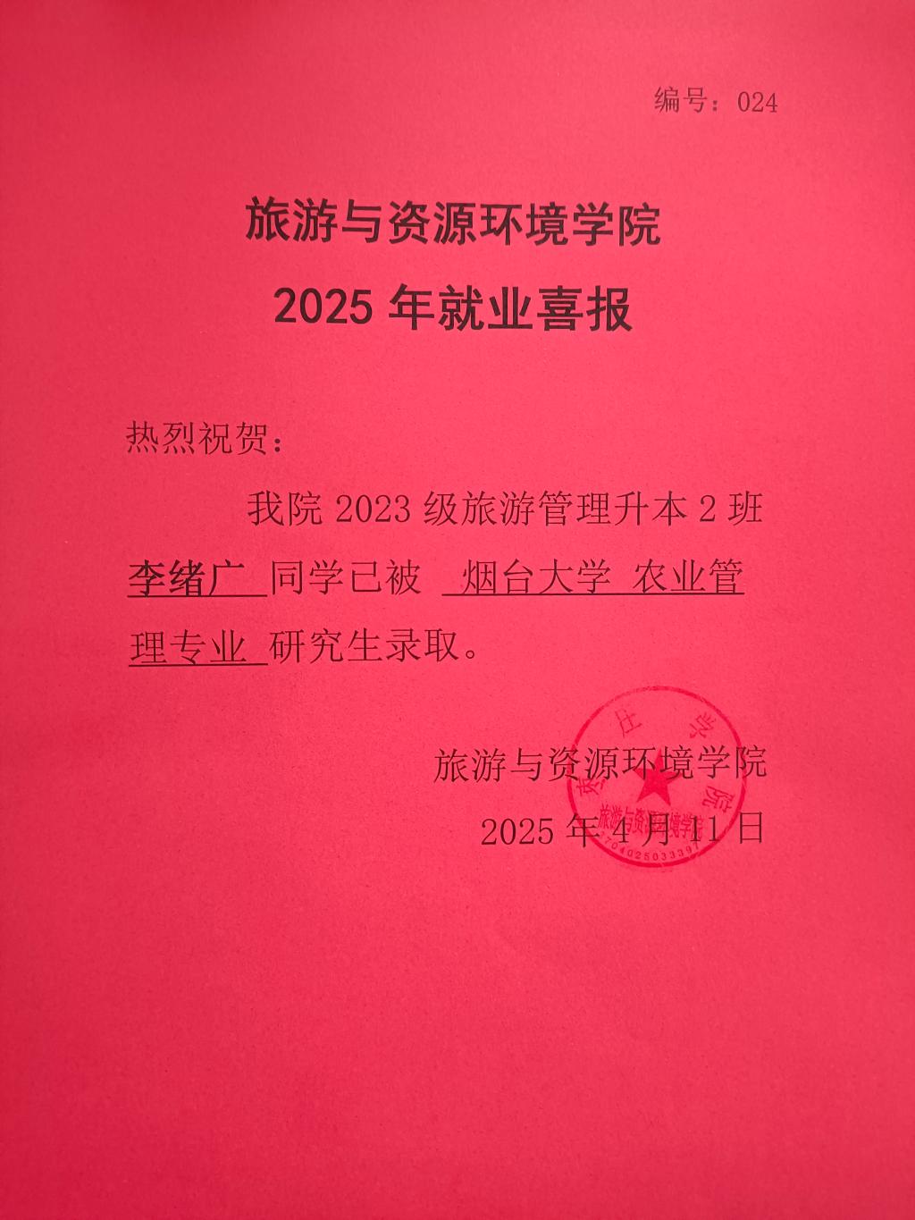 喜报!23旅游管理升本2班李绪广被烟台大学录取!